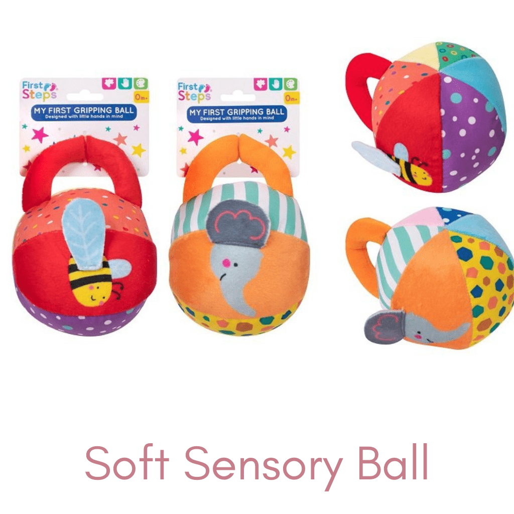 - Sensory Ball - a great sensory toy that helps develop fine motor skills, dexterity and hand eye coordination . Perfect for little hands to hold and experience different textures, bright colours and sounds to engage and stimulate baby’s attention through play.